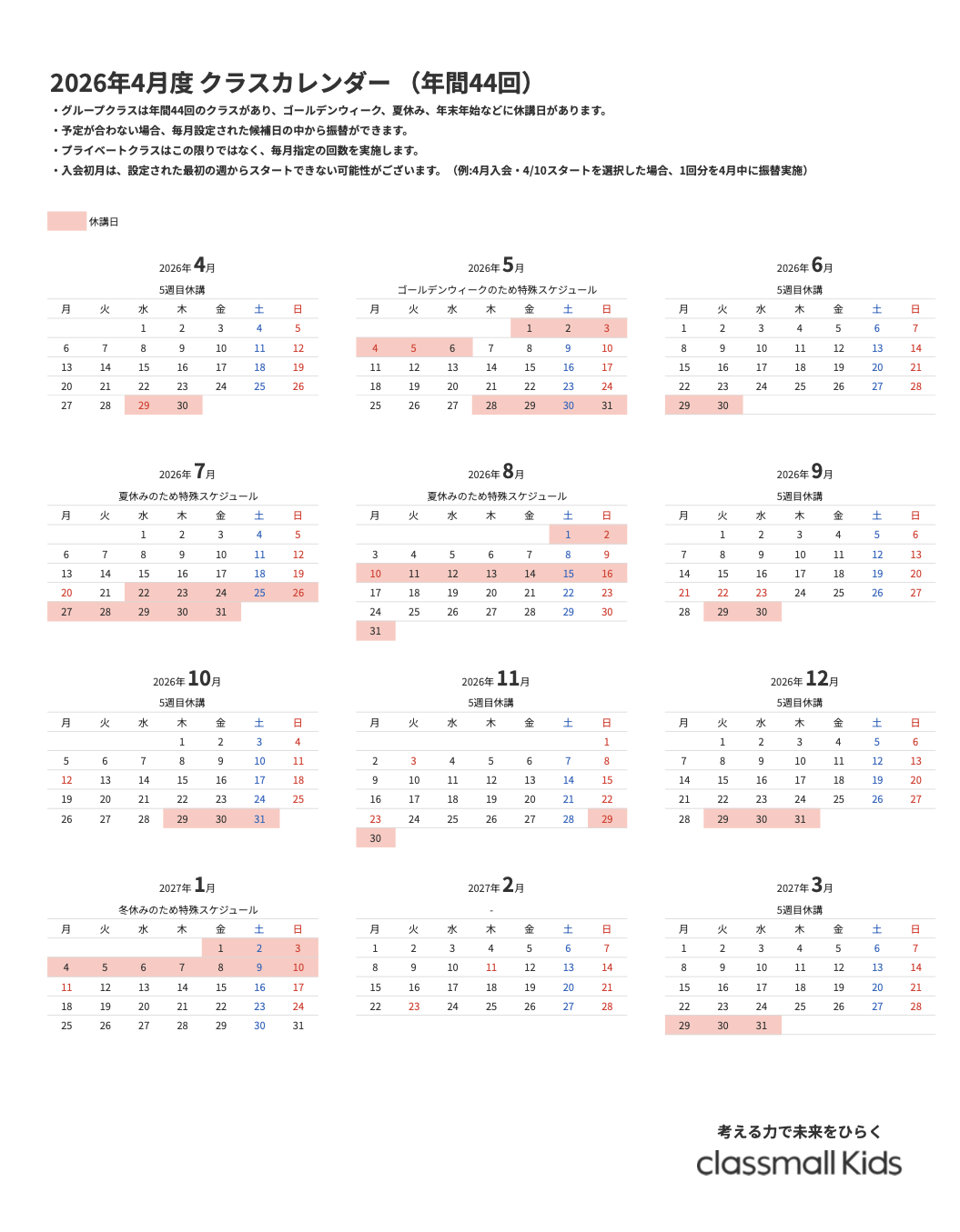 「週1回・月4回」が基本ですが、一部の月で3回となる調整があります。